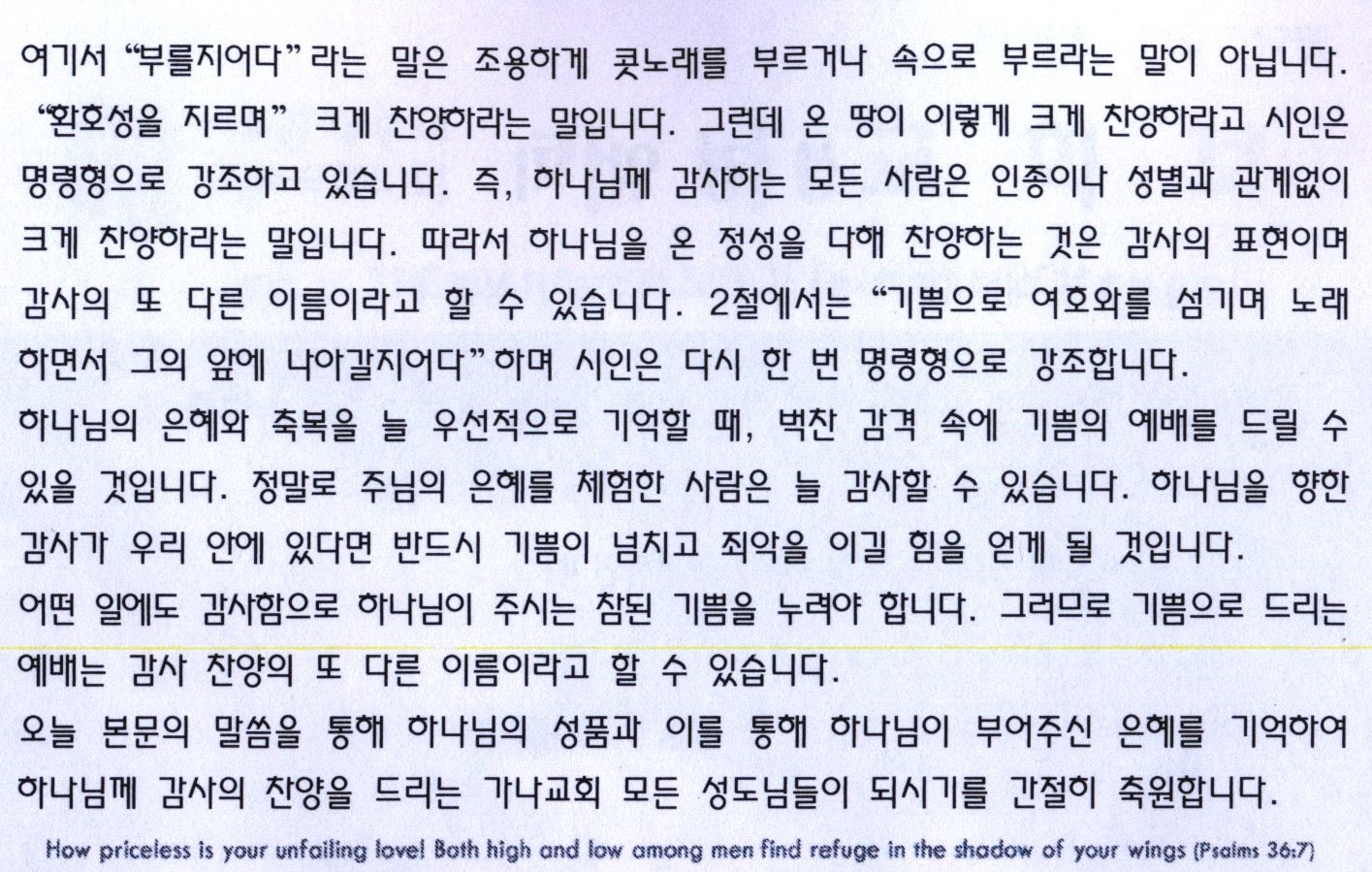4. 감사함으로 그의 문에 들어가며 찬송함으로 그의 궁정에 들어가서 그에게 감사하며 그의 이름을 송축할지어다