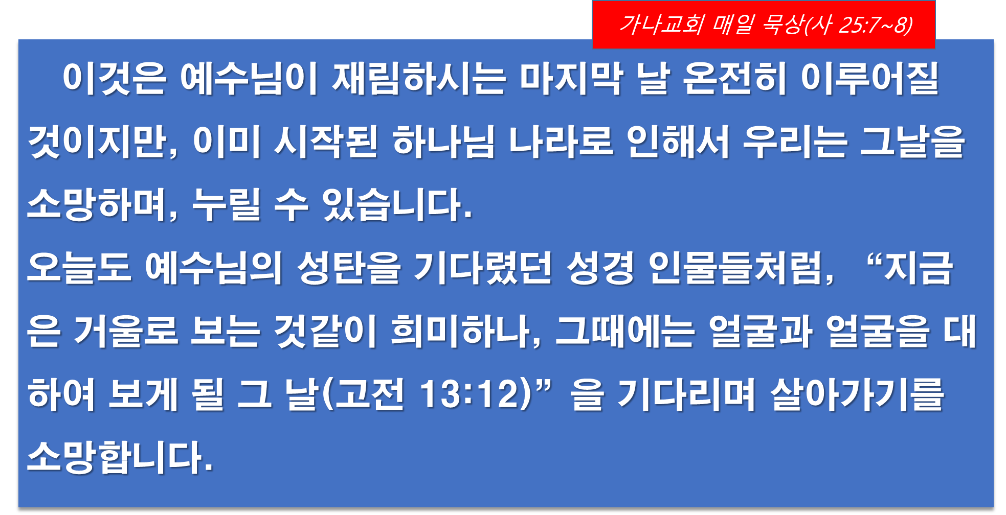 | 다음글 | 시편 48편 14절 | 운영자 | 2020.12.23 | 0 | 161 |