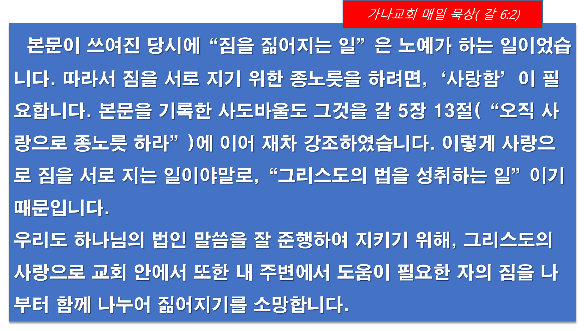| 이전글 | 골로새서 6장 2절 | 운영자 | 2021.02.02 | 0 | 276 |