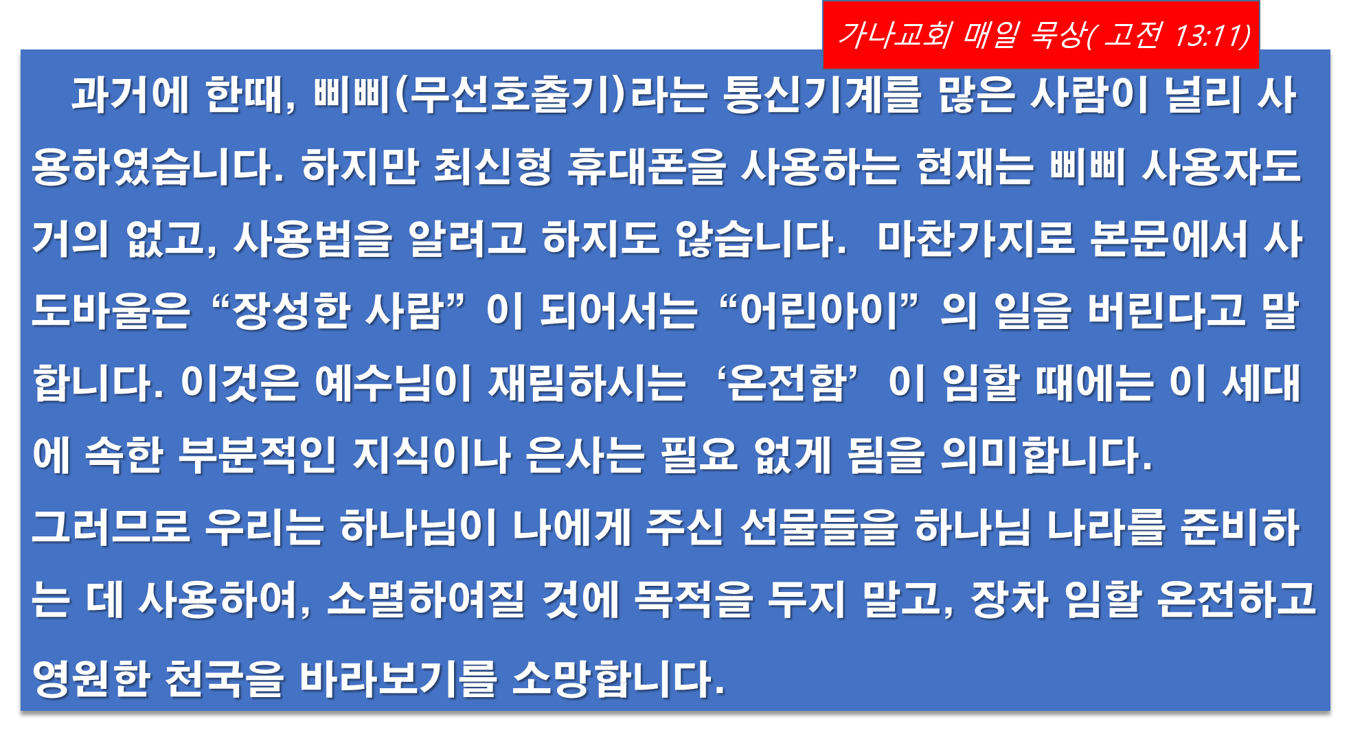 | 다음글 | 잠언 3장 30절 | 운영자 | 2021.03.31 | 0 | 267 |